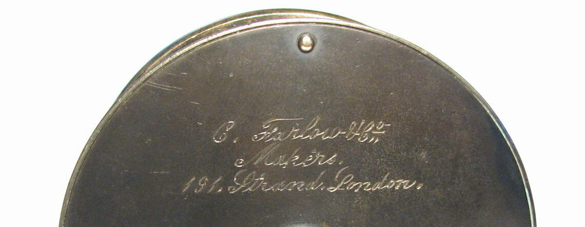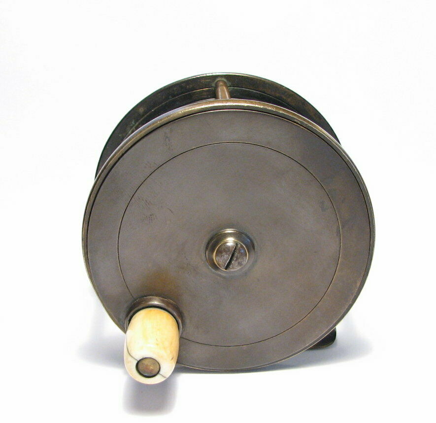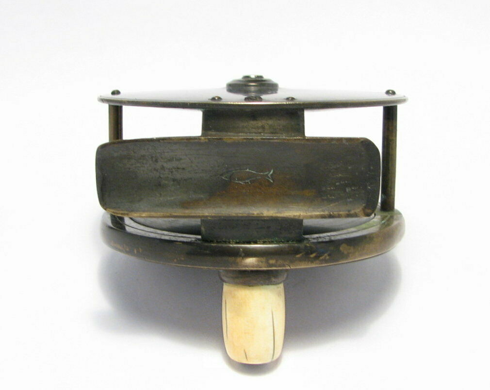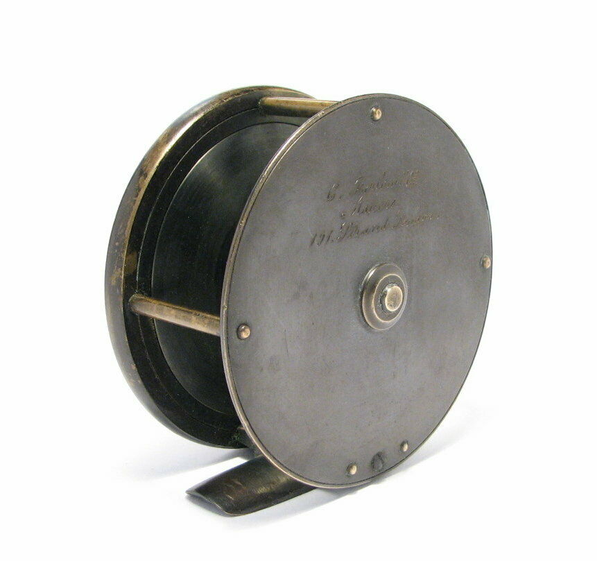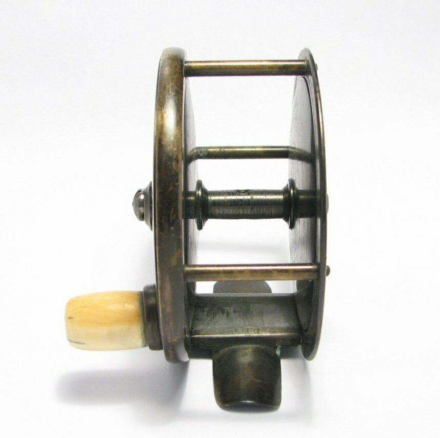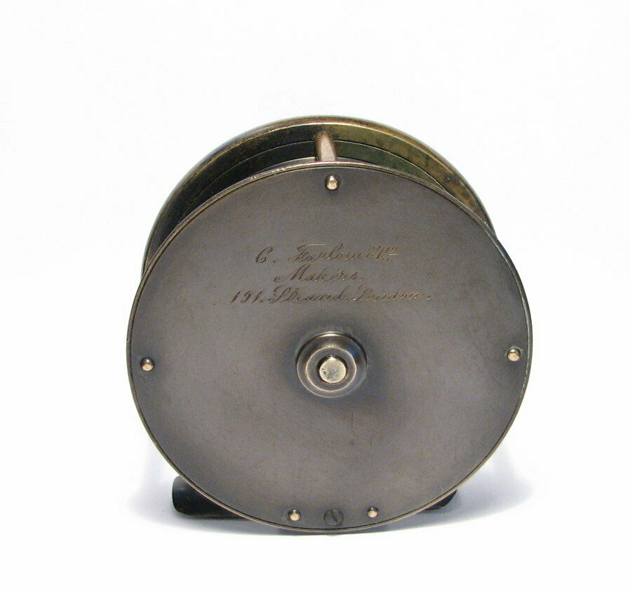 This London based C. Farlow & Co. (1885 – 1894 ) fly reel is all brass and is 3.5″ in diameter and has an attractive mixed patina finish. The Farlow is a large trout or small salmon fly reel sporting Farlow’s Fish Trademark. The reel runs smoothly and has a crisp click. Note that the foot has been shortened on both ends.