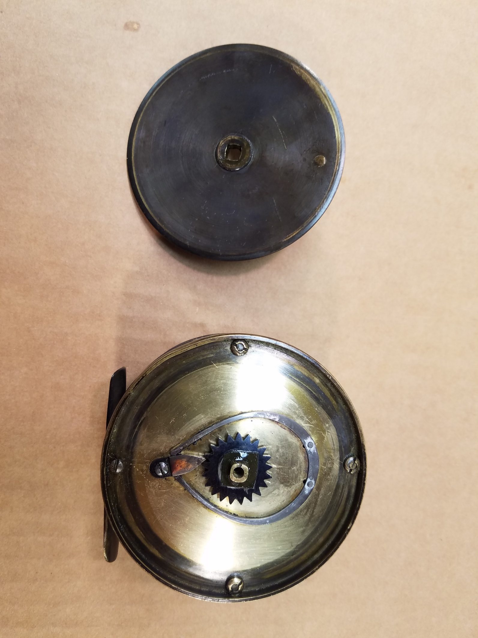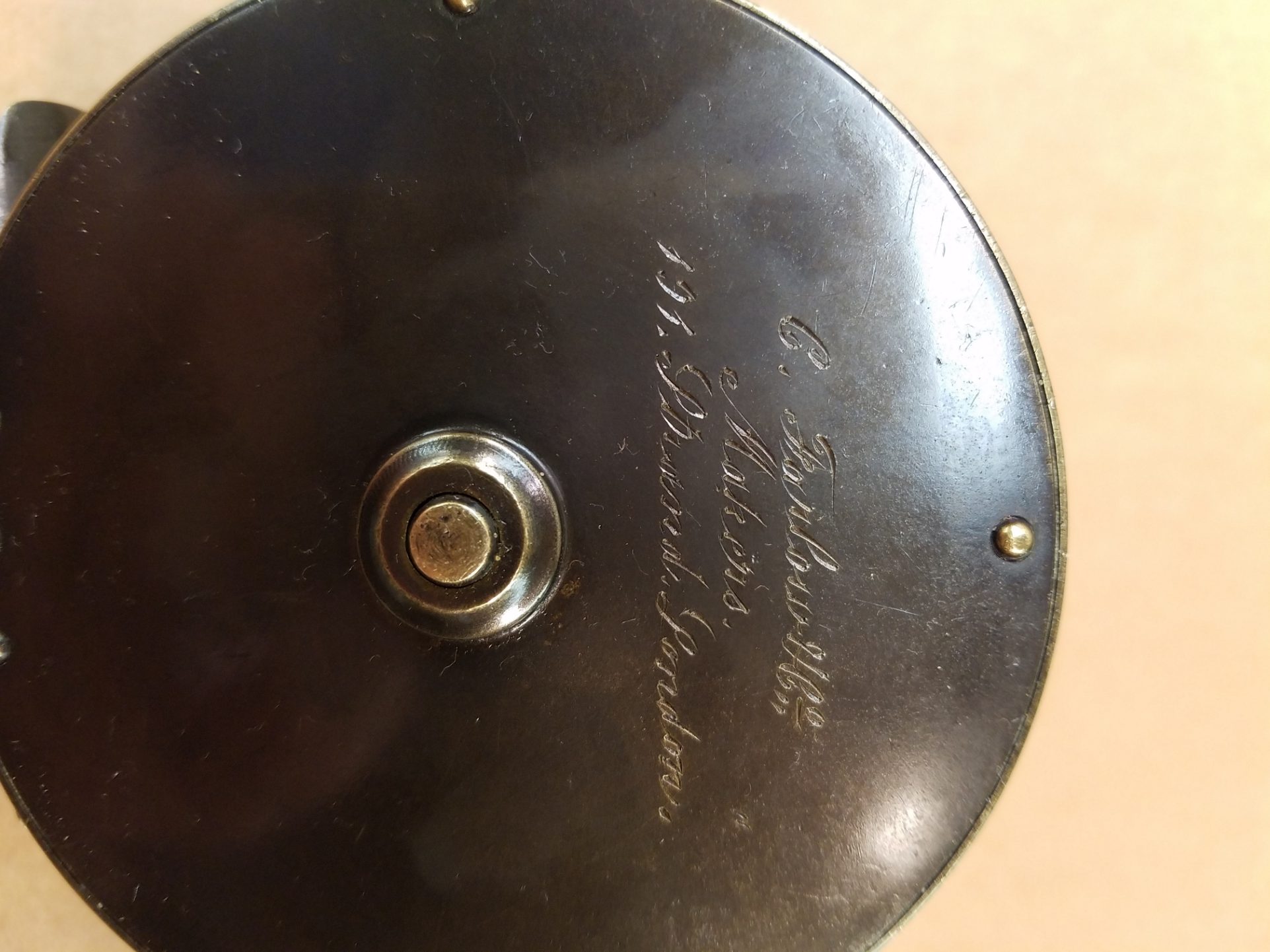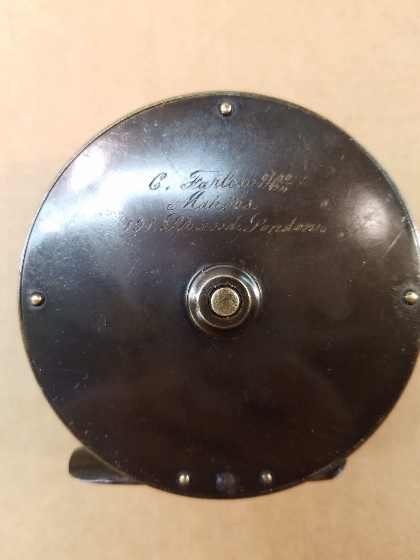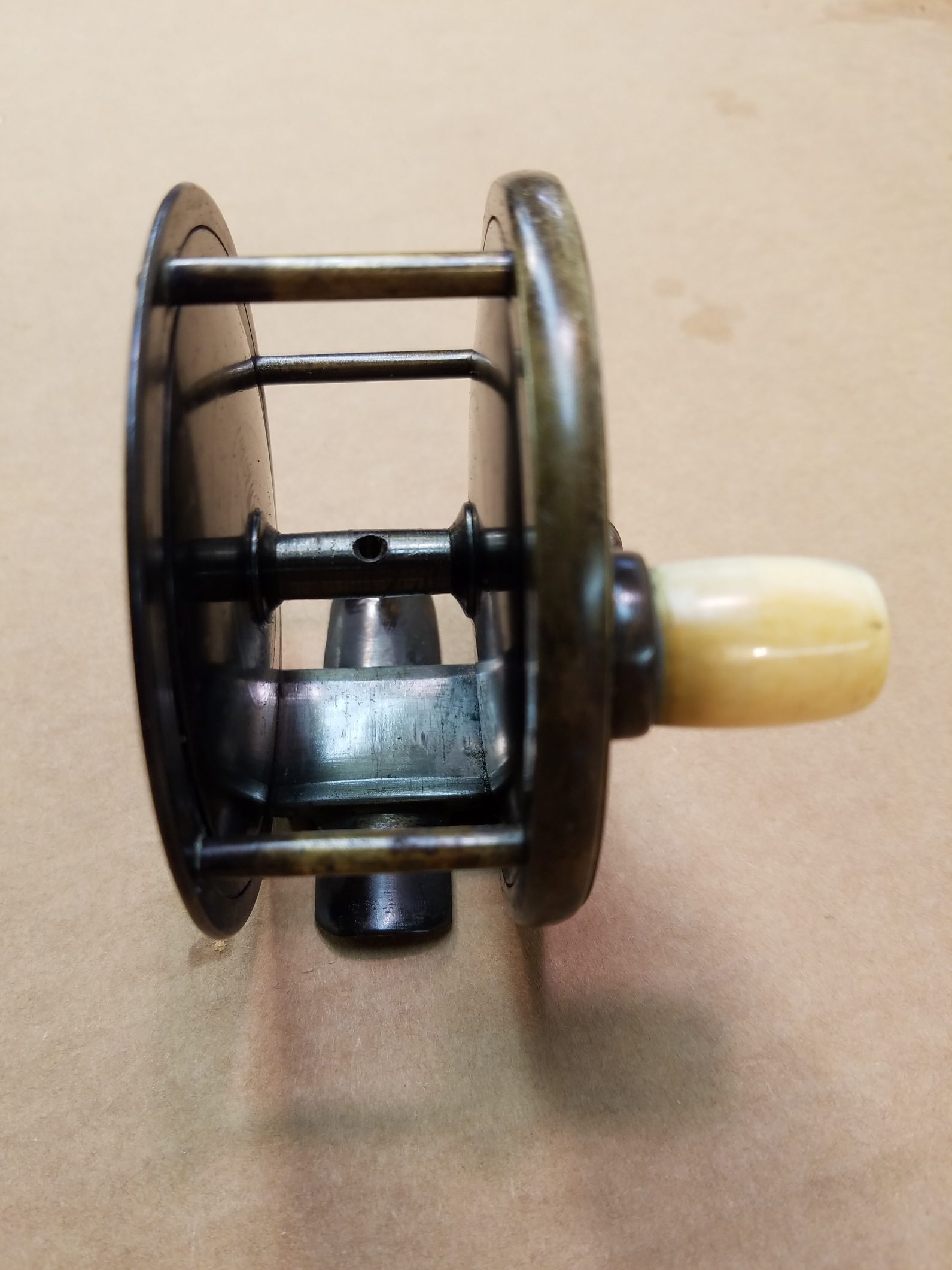 This London based C. Farlow & Co. (1885 – 1894 ) fly reel is all brass and is 3.5″ in diameter and has an attractive mixed patina finish. The Farlow is a large trout or small salmon fly reel sporting Farlow’s Fish Trademark. The reel runs smoothly and has a crisp click. Note that the foot has been shortened on both ends.