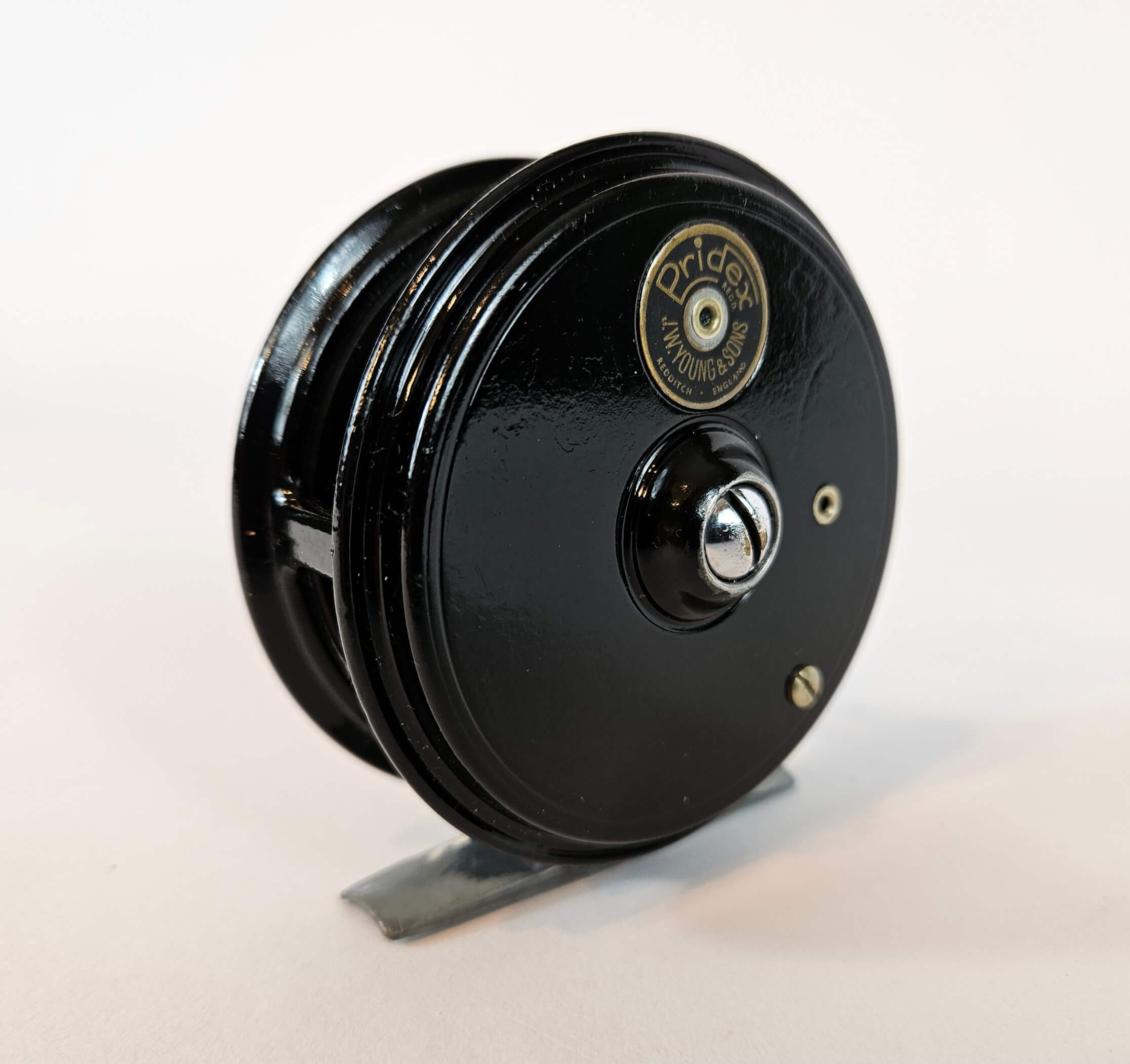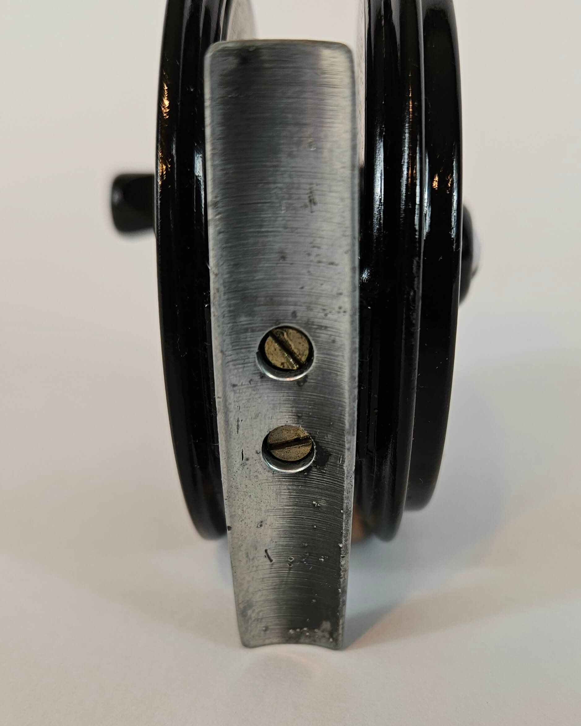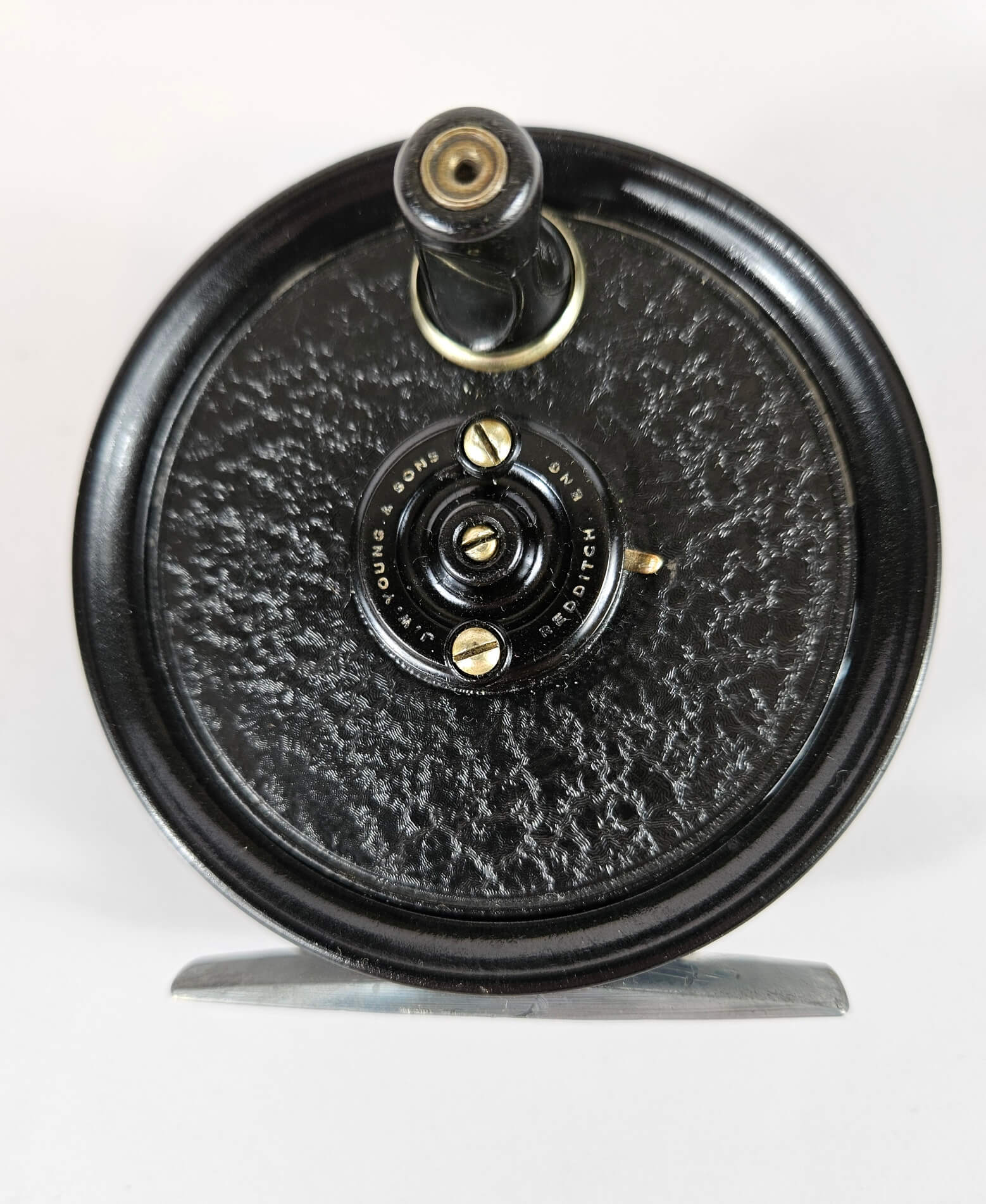 J.W. Young’ smallest trout reel a 3” diameter X 1” wide with a drum width of 9/16th. Made in England. The reel weighs 5.2 oz. The finish is very good and in excellent working condition. Comes with padded Mangrove fly reel case.