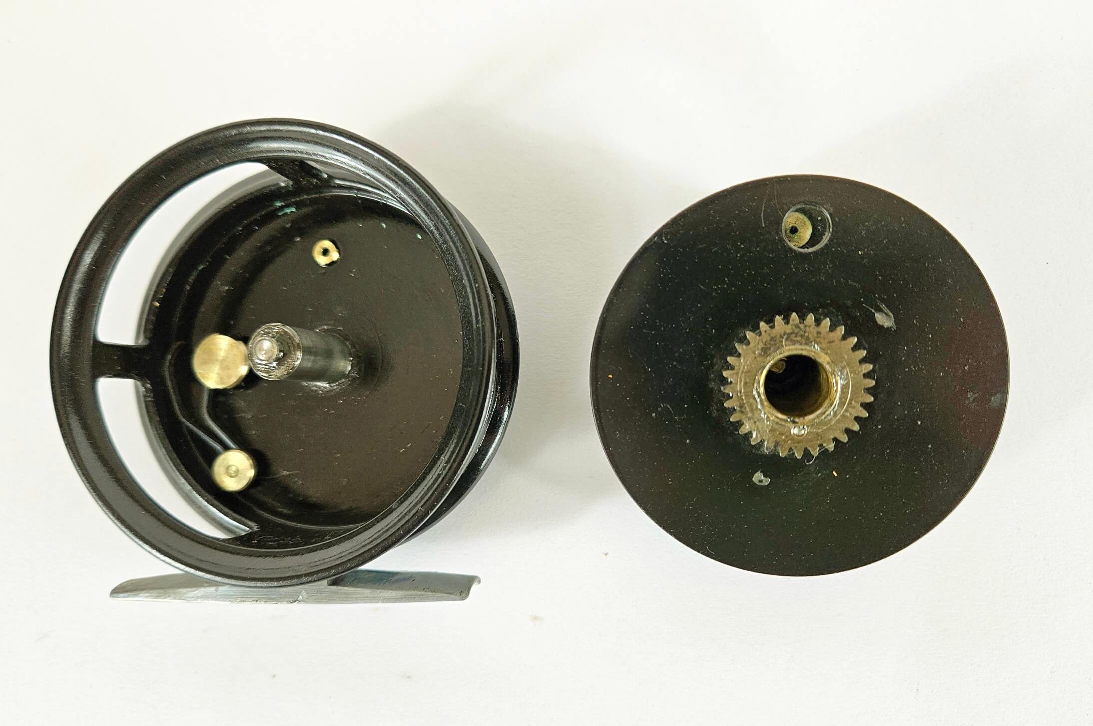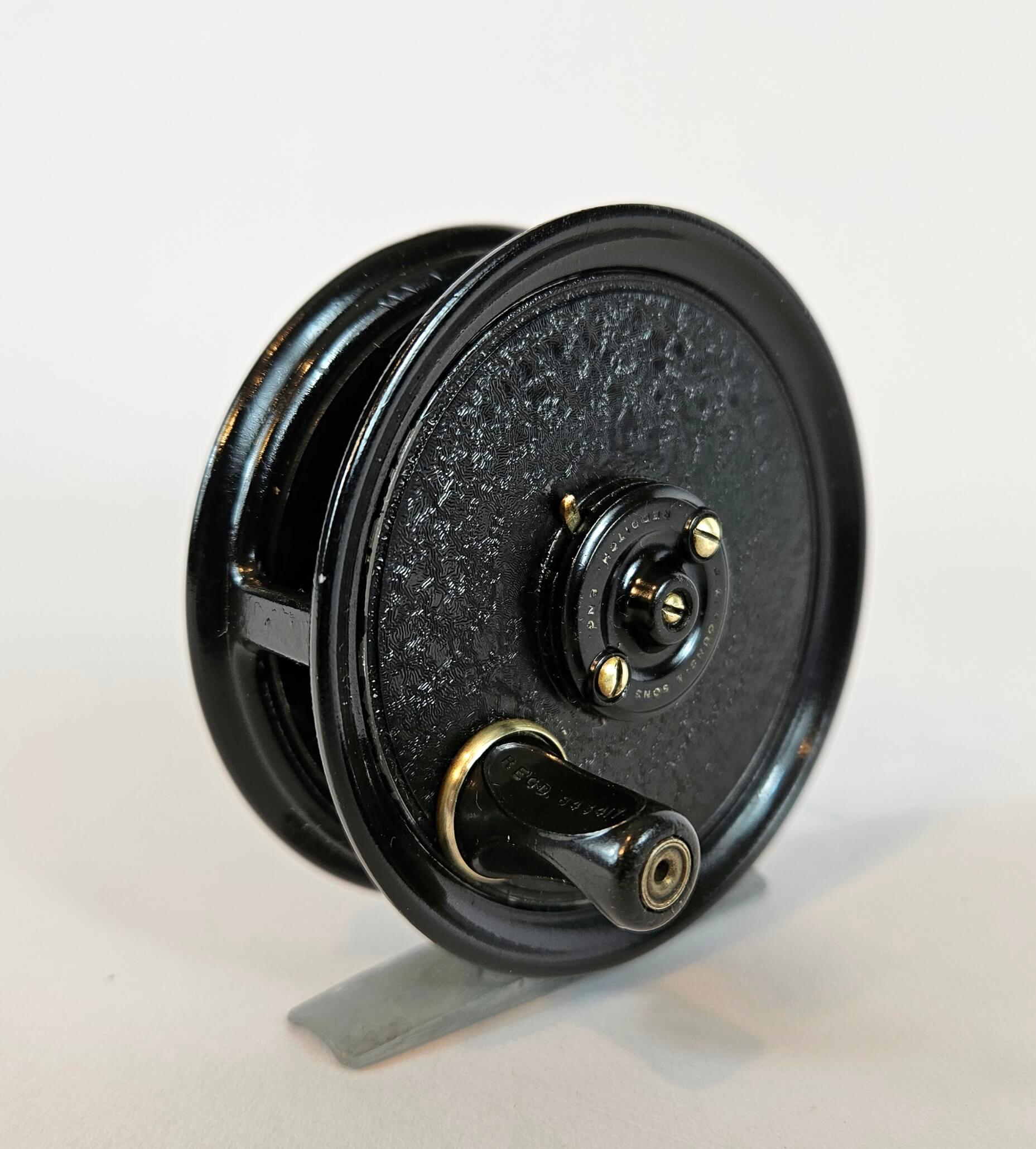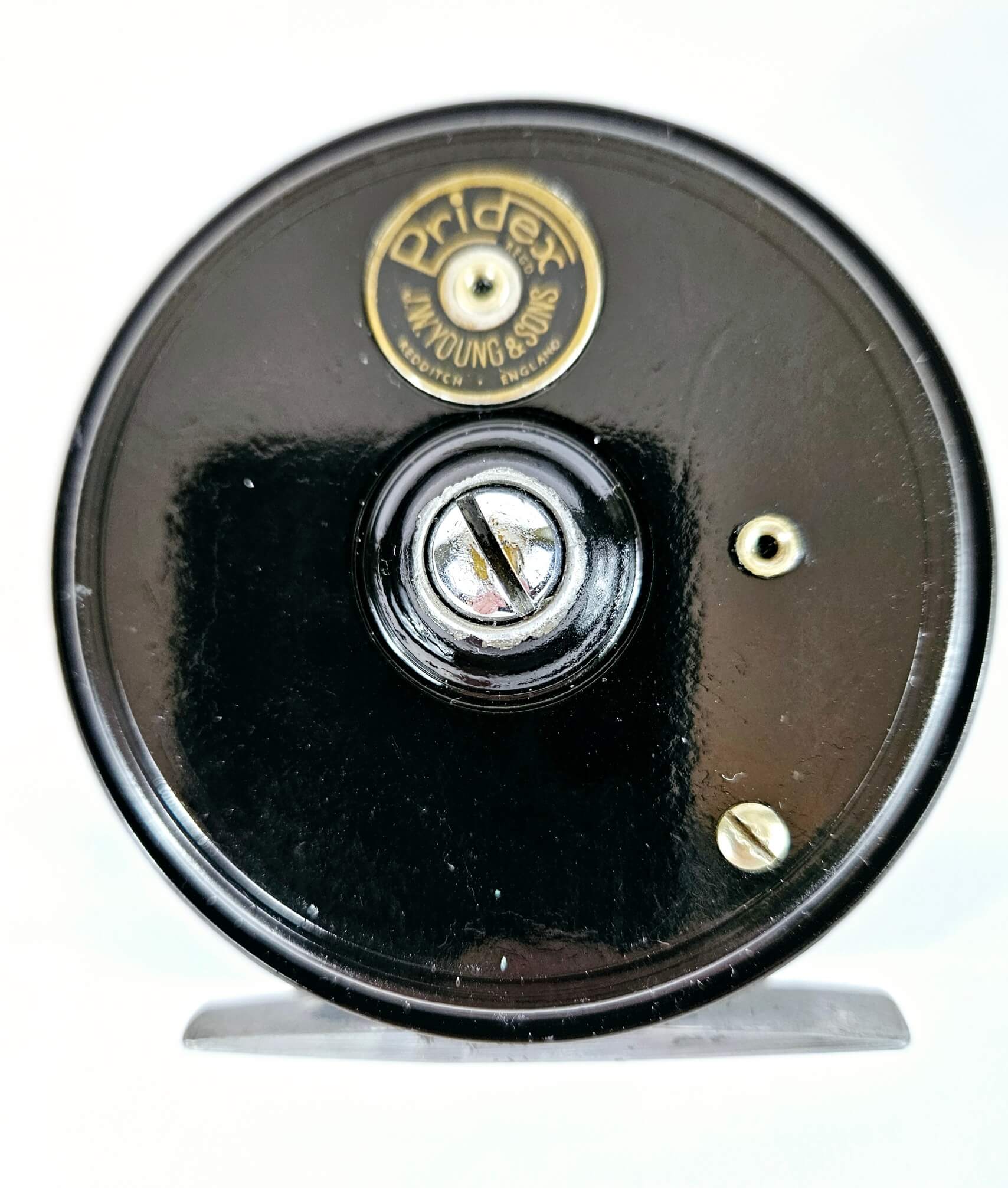 J.W. Young’ smallest trout reel a 3” diameter X 1” wide with a drum width of 9/16th. Made in England. The reel weighs 5.2 oz. The finish is very good and in excellent working condition. Comes with padded Mangrove fly reel case.