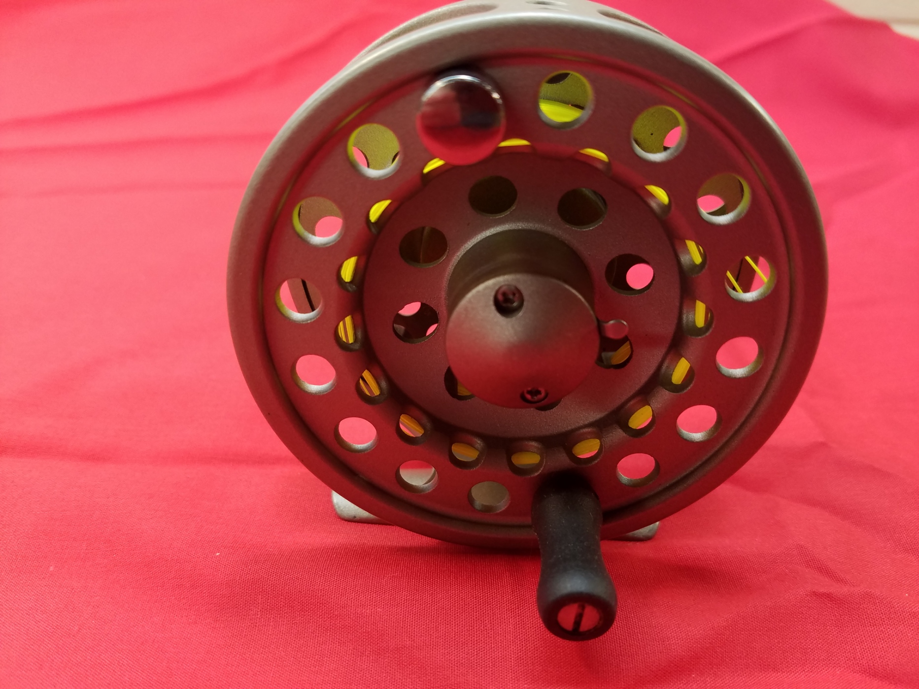 This gently used Okuma SLV 4/5 reel works well with 4 and 5wt lines. The reel weighs 4.8 ounces and has a diameter of 3 inches. The Okuma SLV Fly Reel features a super large arbor spool, a multi-disc stainless steel and cork drag system, a precision-machined steel spool shaft, and a one-way roller bearing all encased in a die-cast aluminum frame. The larger spool arbor enables fast line retrieval and allows for a larger drag system in the inner arbor.