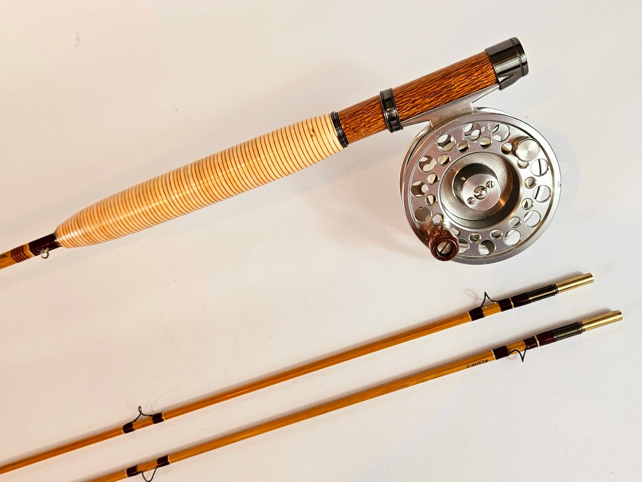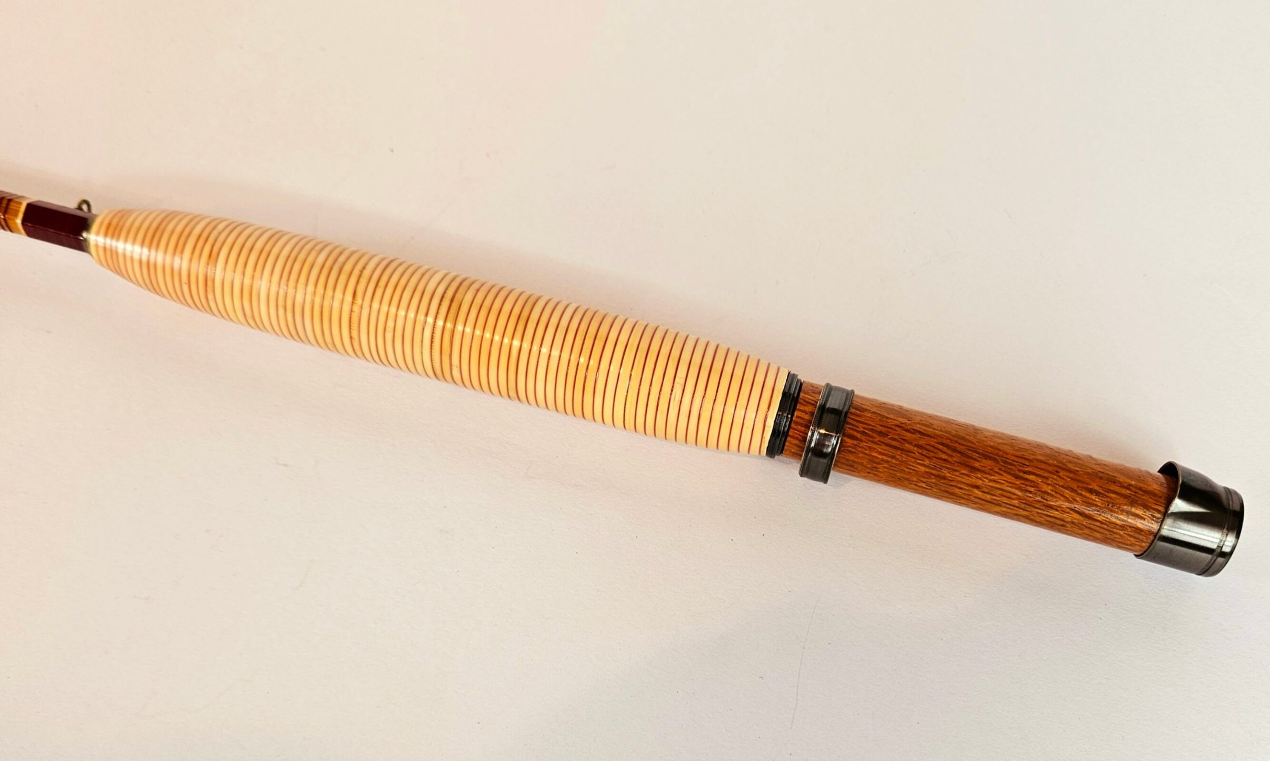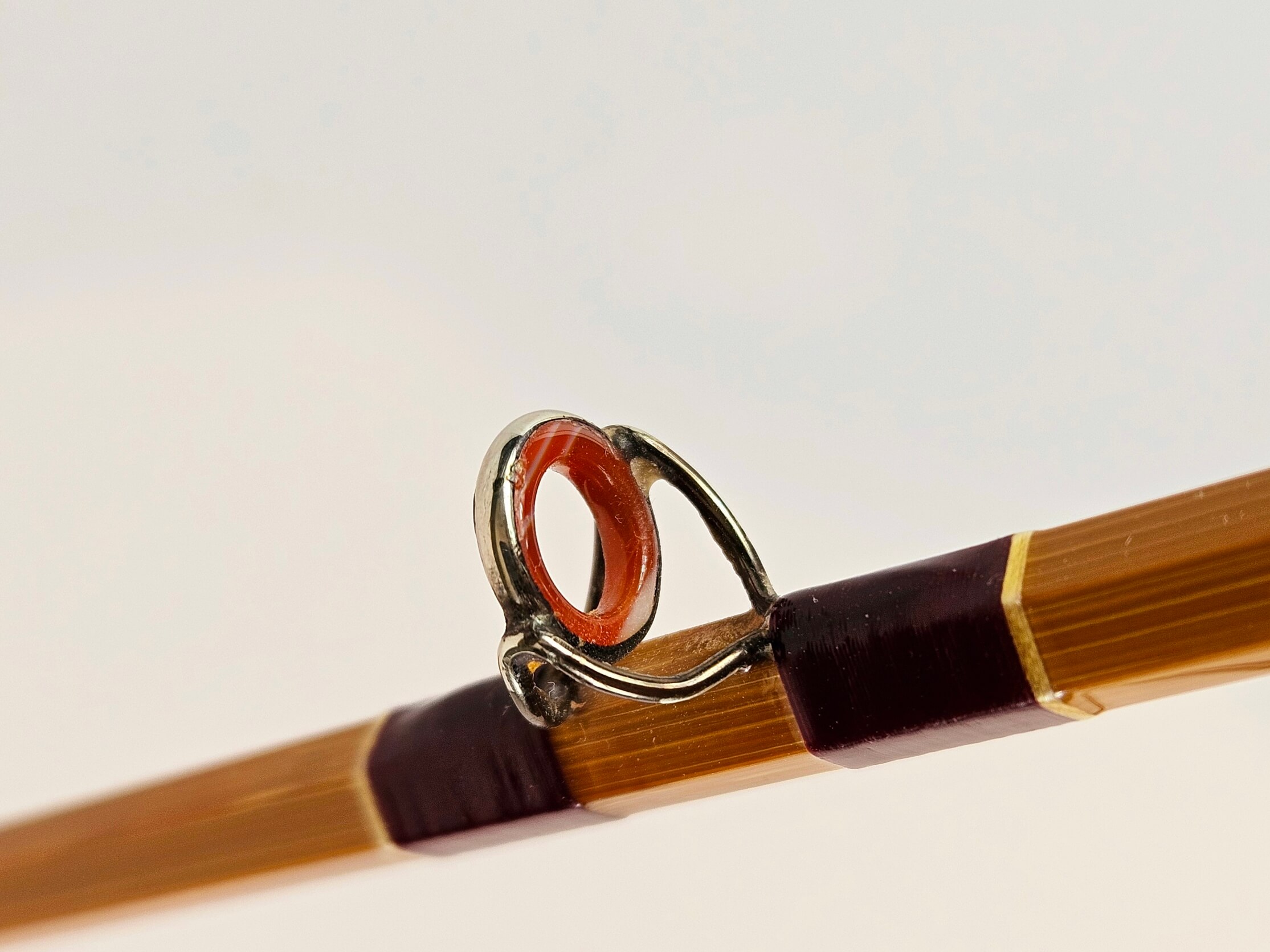 The cigar style rattan grip is accented with candy red thread and is 6 1/4” long. The nickel silver down locking cap and ring reel seat is coupled with an exotic snakewood seat spacer balancing nicely with black hardware and claret wraps. Adorned with a 18% NS candy red & white agate stripper guide. The rod is finished in oxidized hardware and step-down ferrules giving the rod a sleek overall appearance. This rod delivers a very distinctive look on the stream.