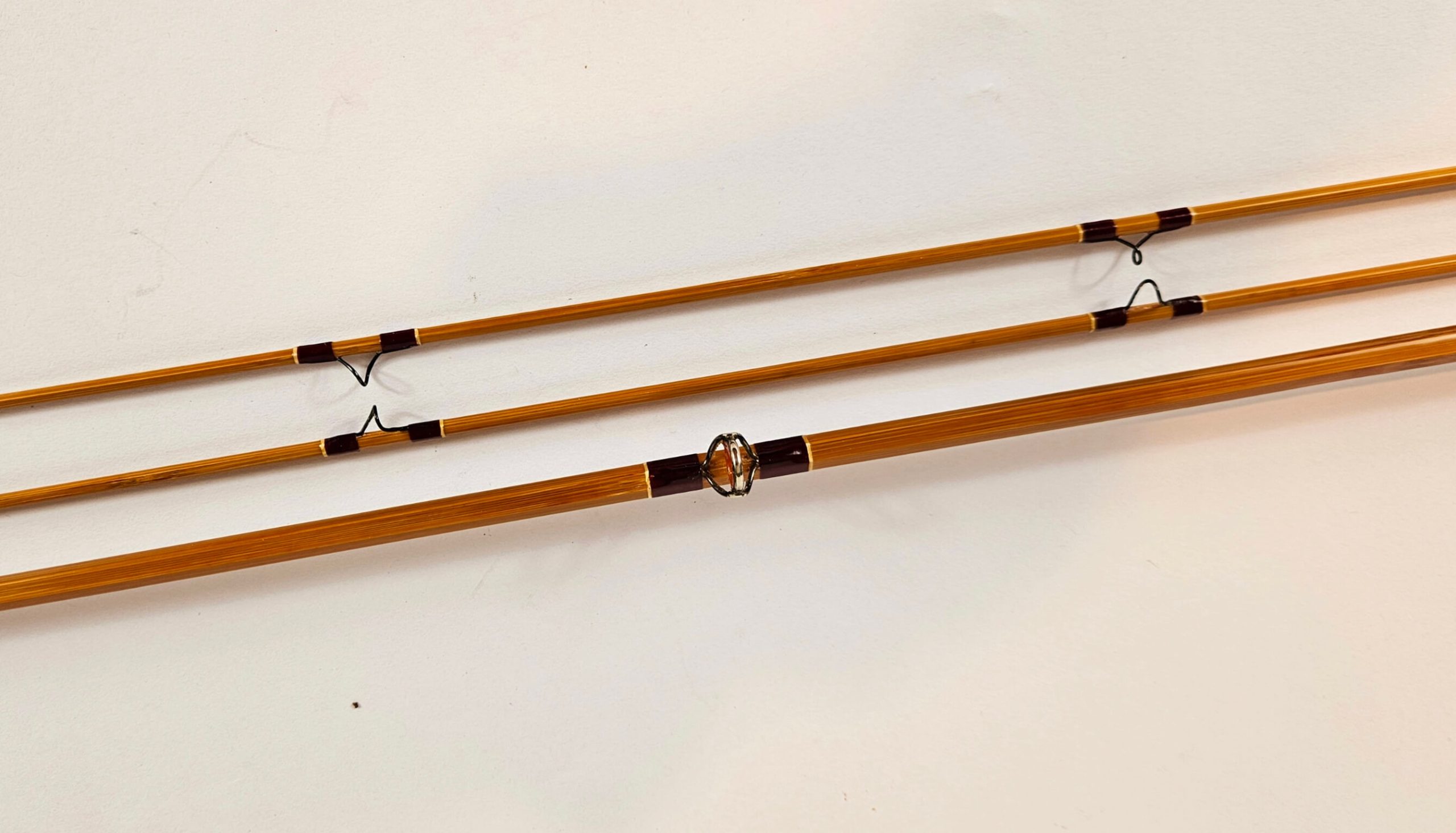 The cane is a Golden honey tone finished with spar varnish and wrapped with claret silk tipped with cream silks. The ring style hook keeper is wrapped in claret finished with a band of cream completed with the signature wrap sporting 5 bands of claret cumulating in the model name and maker.