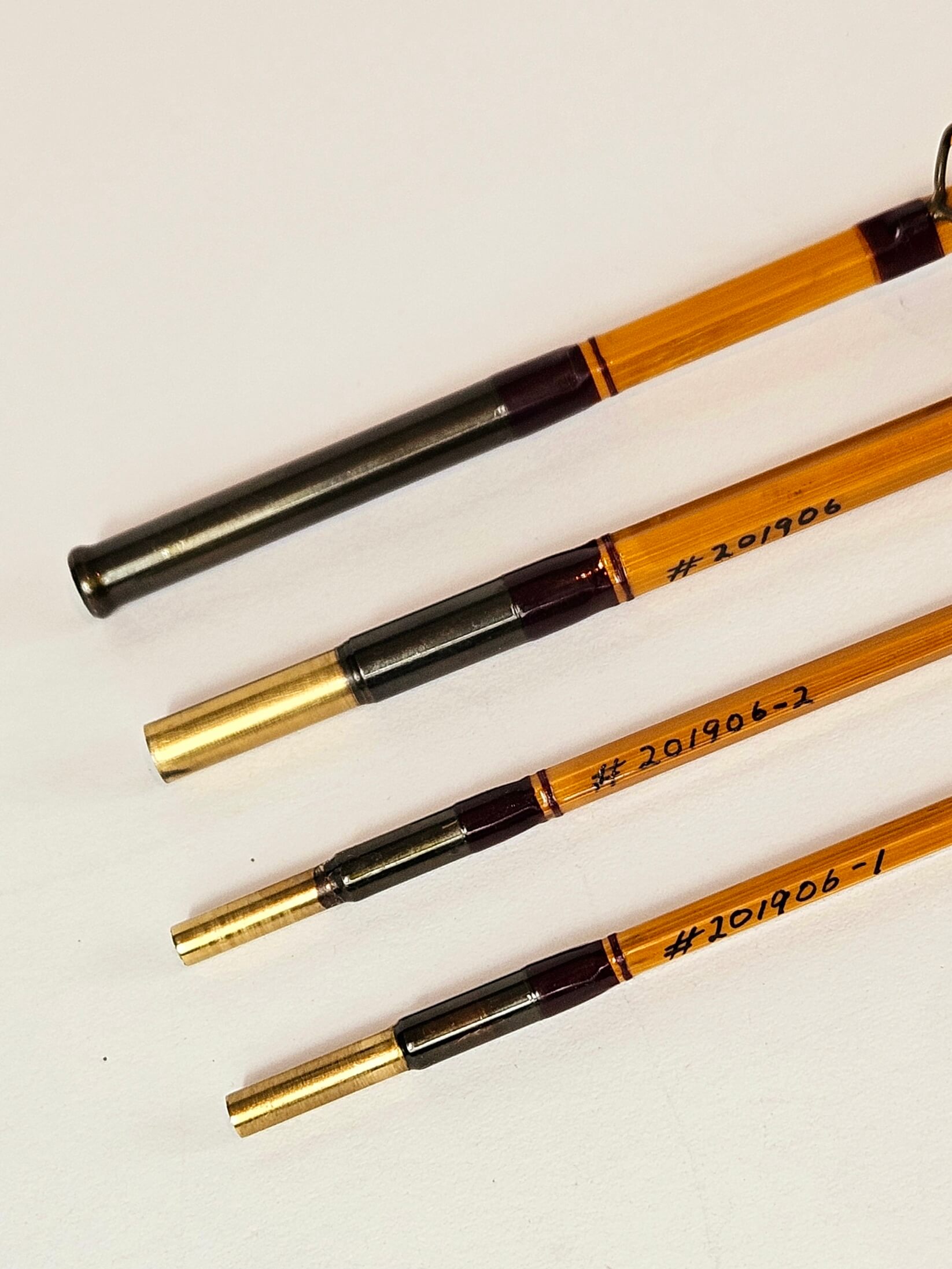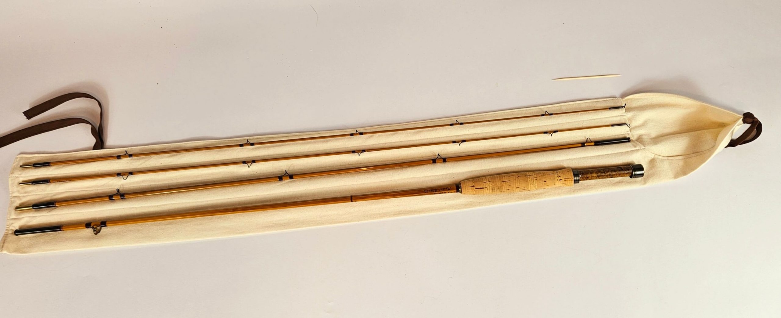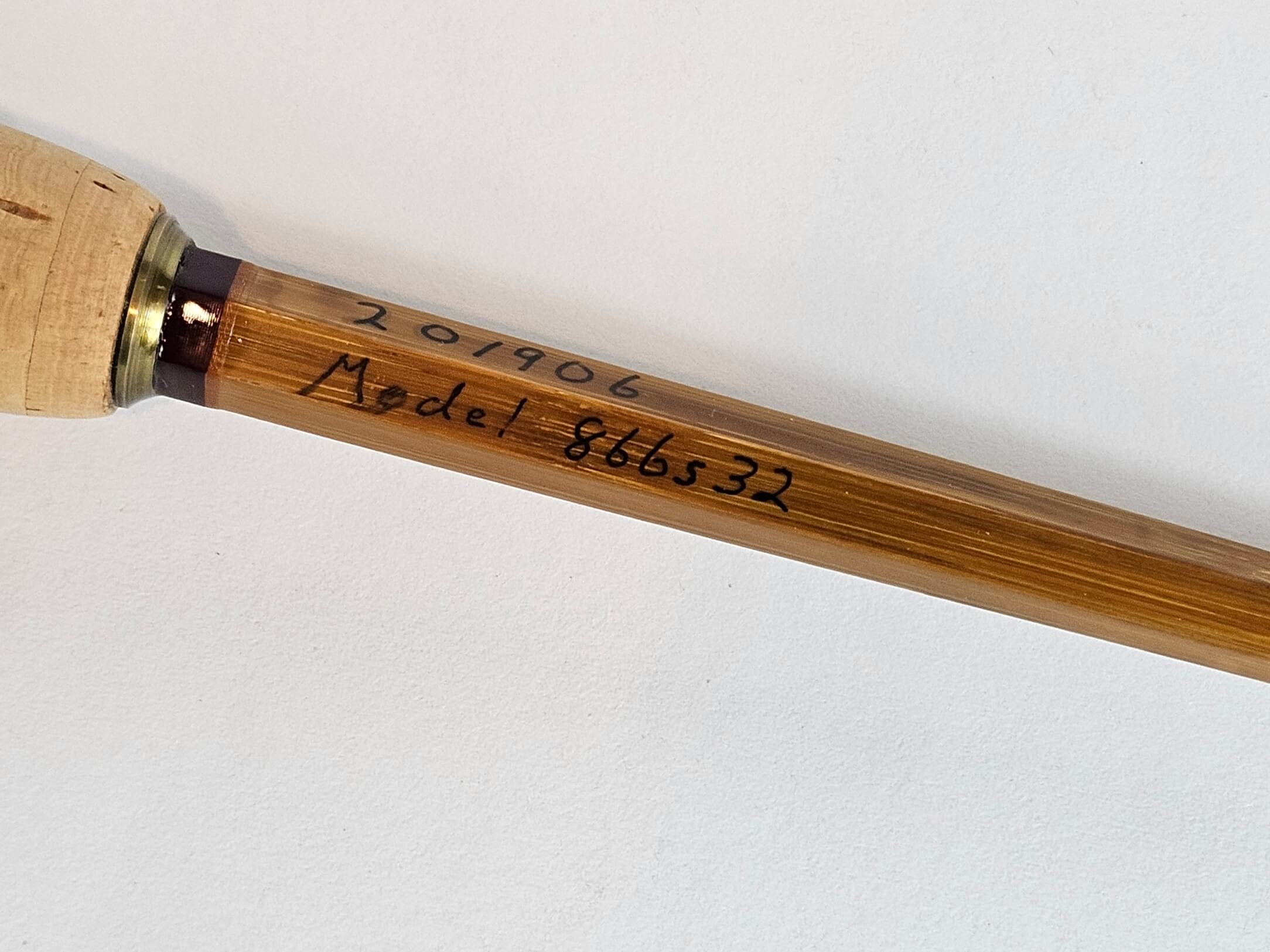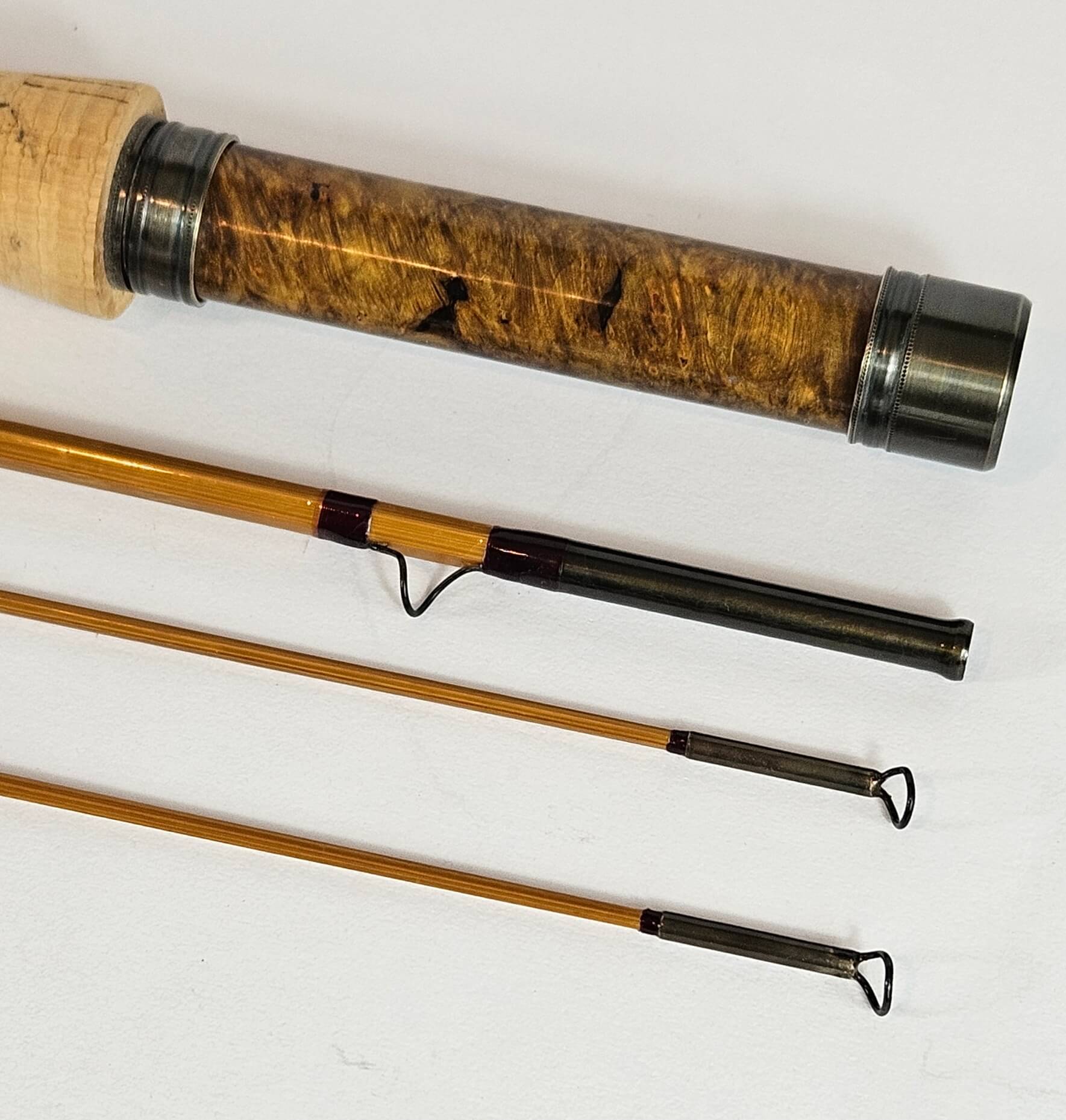 The cane is a caramel coffee tone finished with spar varnish and wrapped with garnet silk tipped with golden silks. The signature wrap sports a band of garnet tipped with gold silk cumulating in the model name and maker. The rod taper features a swelled butt.
