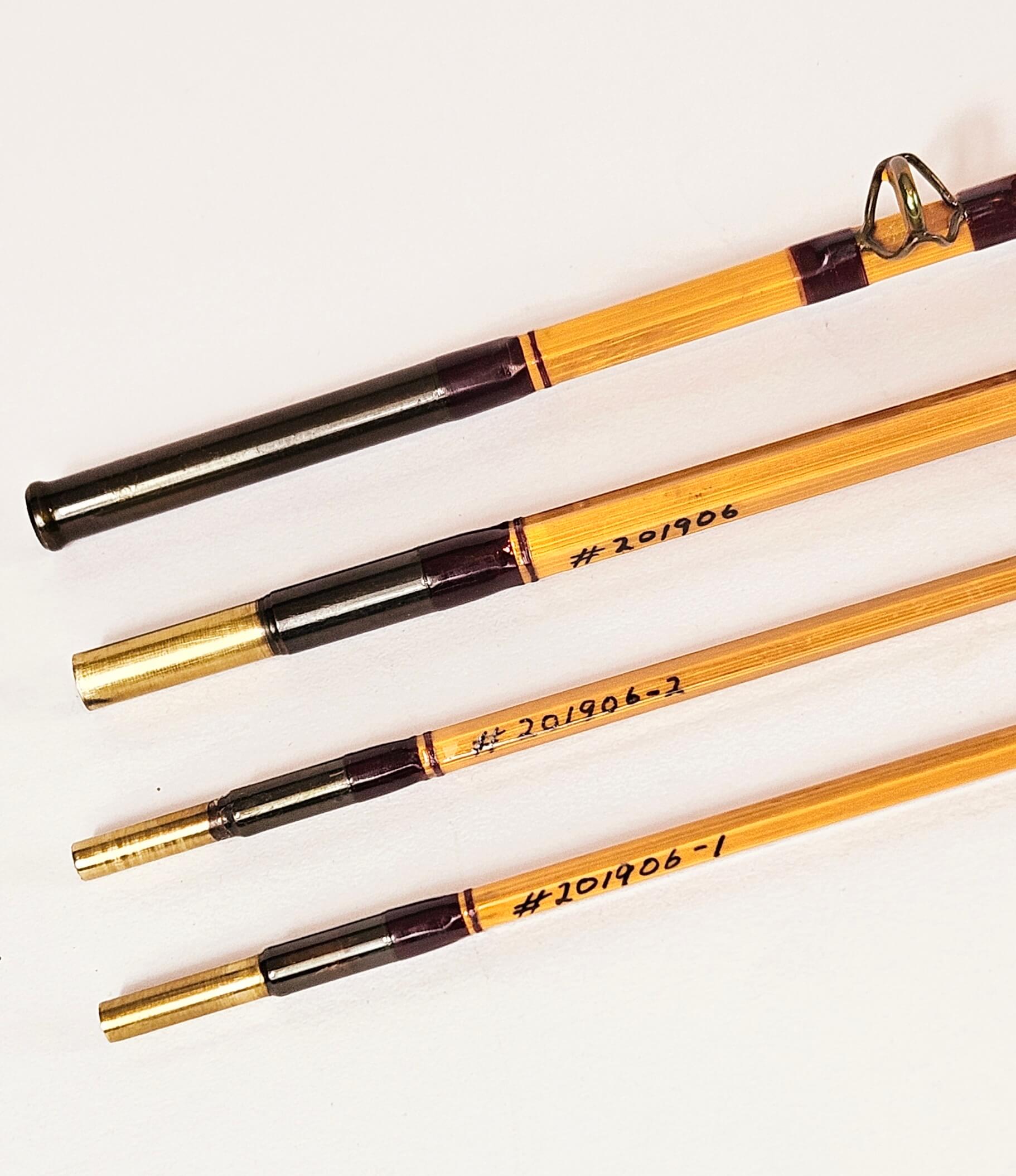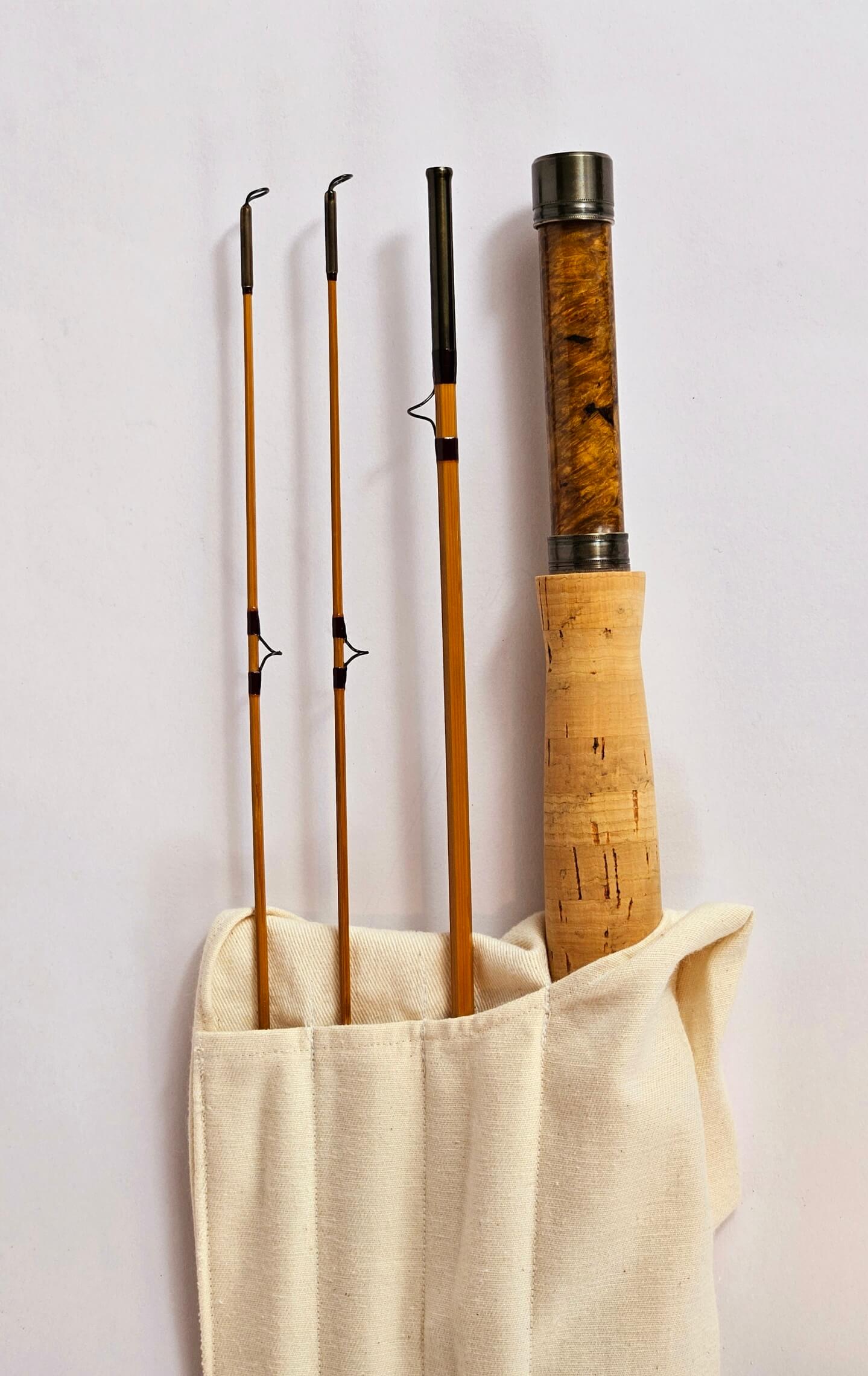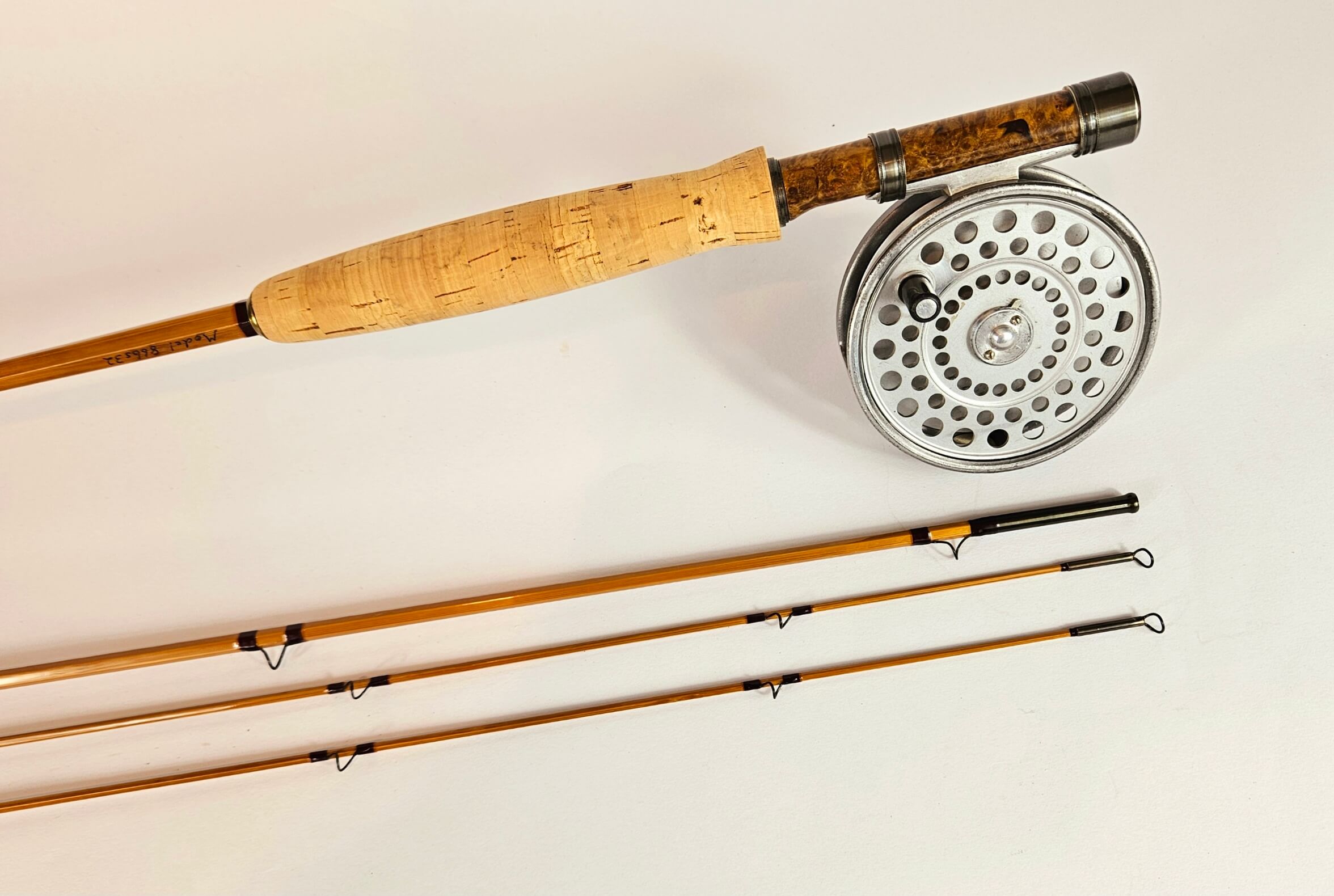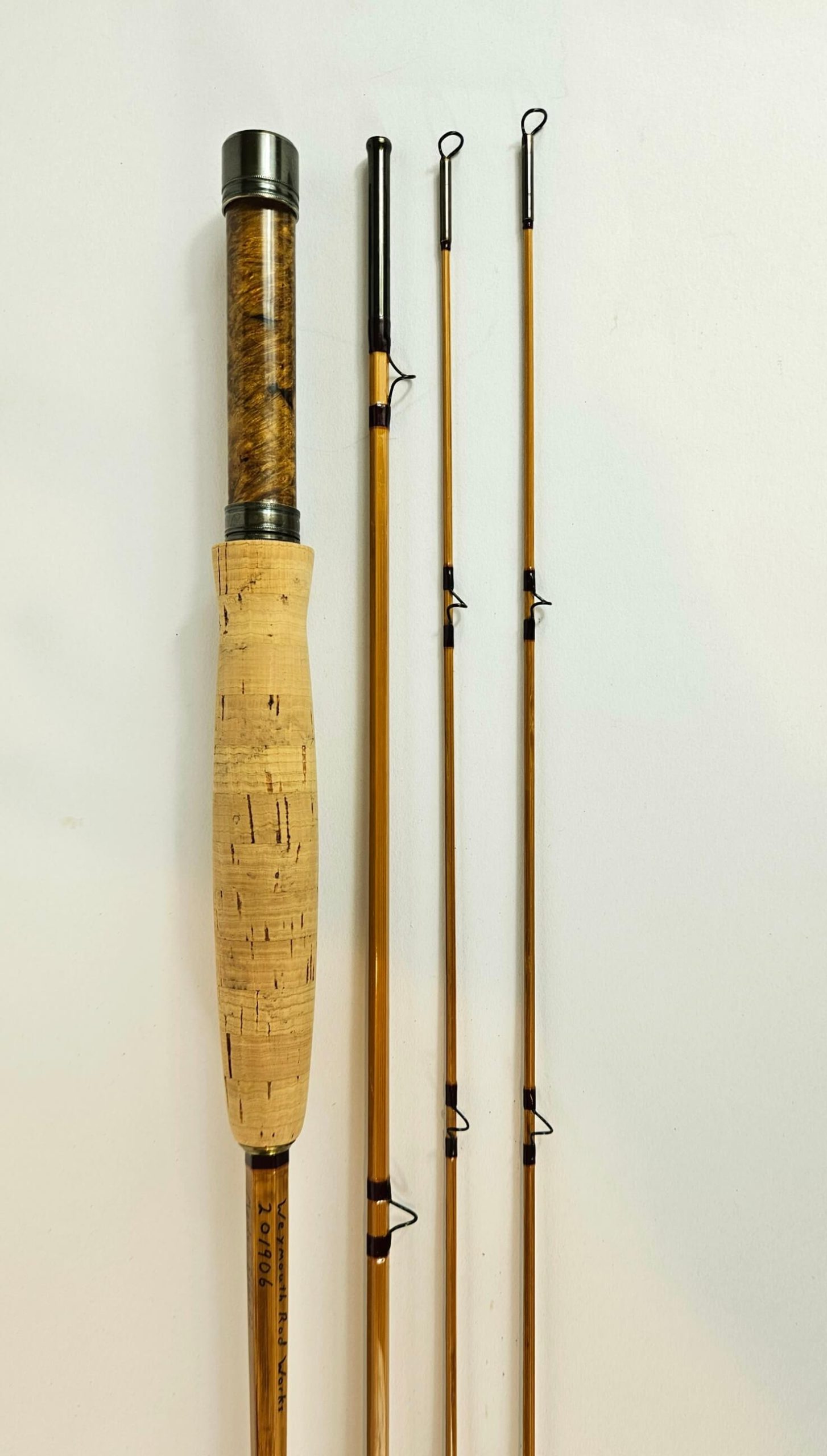 The cane is a caramel coffee tone finished with spar varnish and wrapped with garnet silk tipped with golden silks. The signature wrap sports a band of garnet tipped with gold silk cumulating in the model name and maker. The rod taper features a swelled butt.
