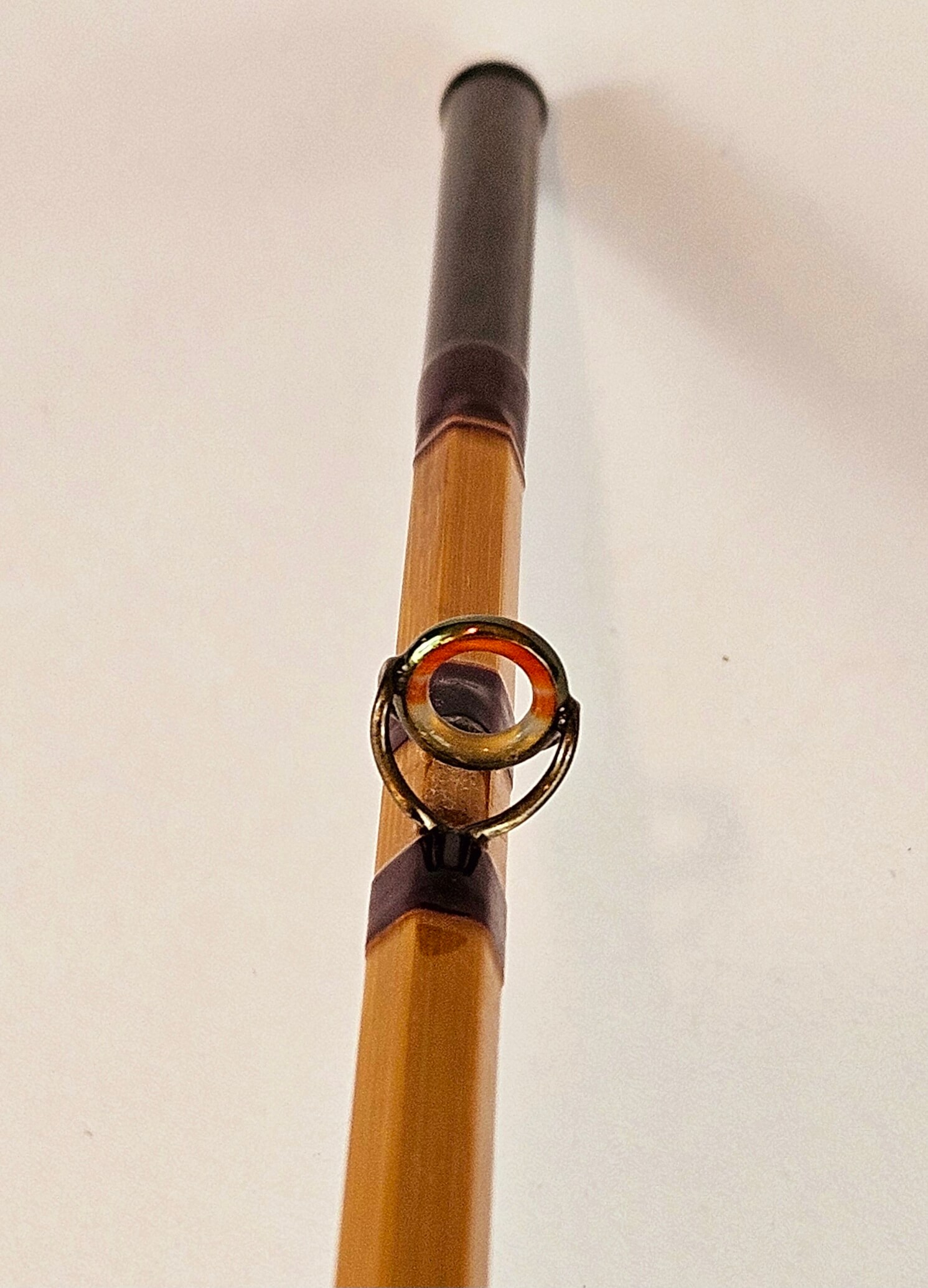 The flor grade grip is a western style and is 6” long. The nickel silver down locking sliding band reel seat is coupled with a dark mortised exotic hardwood seat spacer balancing nicely with the caramel toned cane. Adorned with a 18% NS red & white agate Stripper guide. The rod is finished in oxidized hardware and step-down ferrules giving the rod a sleek overall appearance.