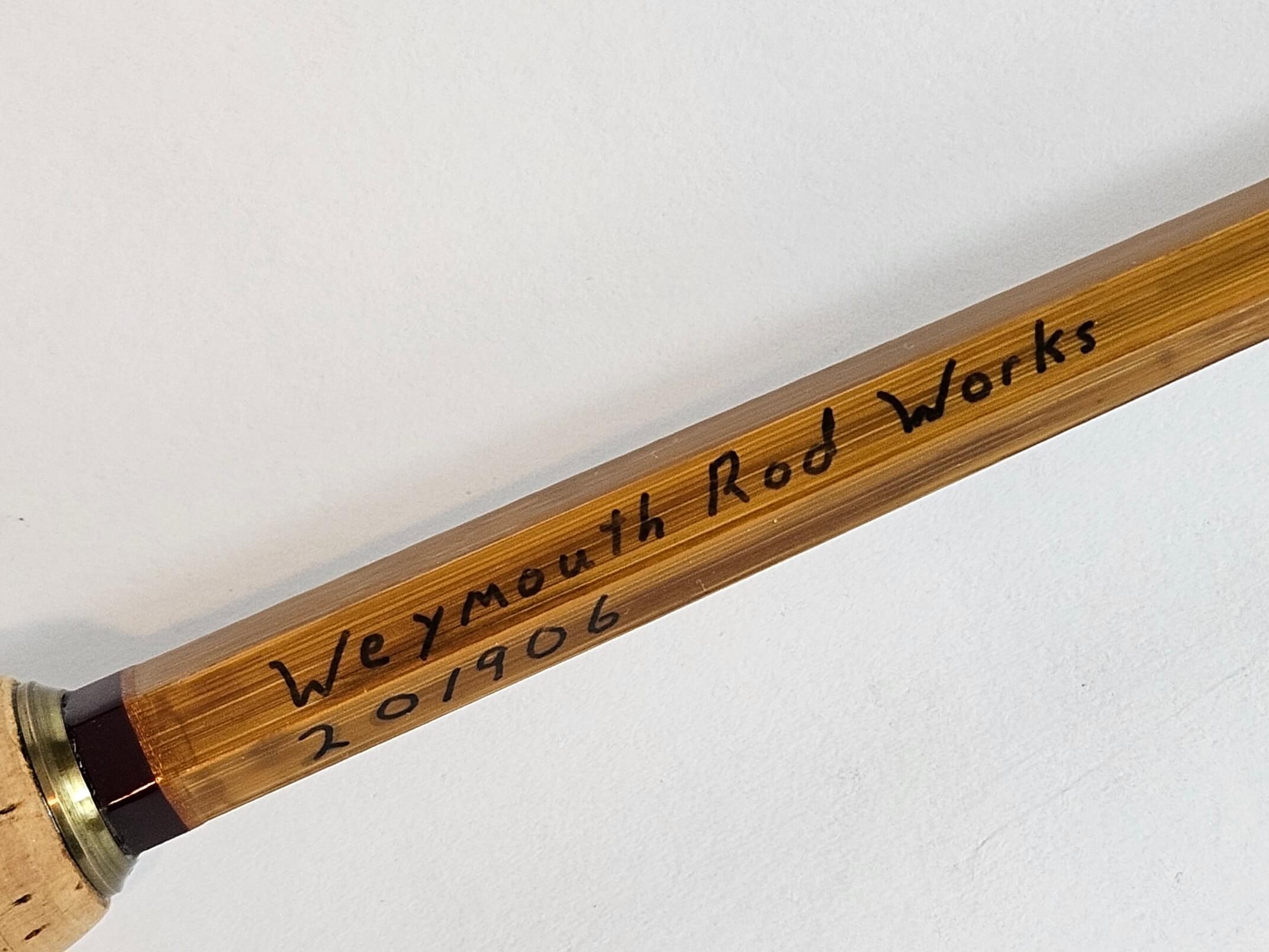 A gently used Weymouth Rod Works signature model 866 serial #201906. This 3-pc, 2-tip rod is 8’ 6″, and built for 6-7 wt line. The finished rod weighs 5.4 ounces and has a medium action. Built in a hex configuration. A very capable rod, the model 867 has the backbone to throw those streamers and sweepers from a canoe or drift boat then pick up that heavy line from the water and pop it back with ease and accuracy.