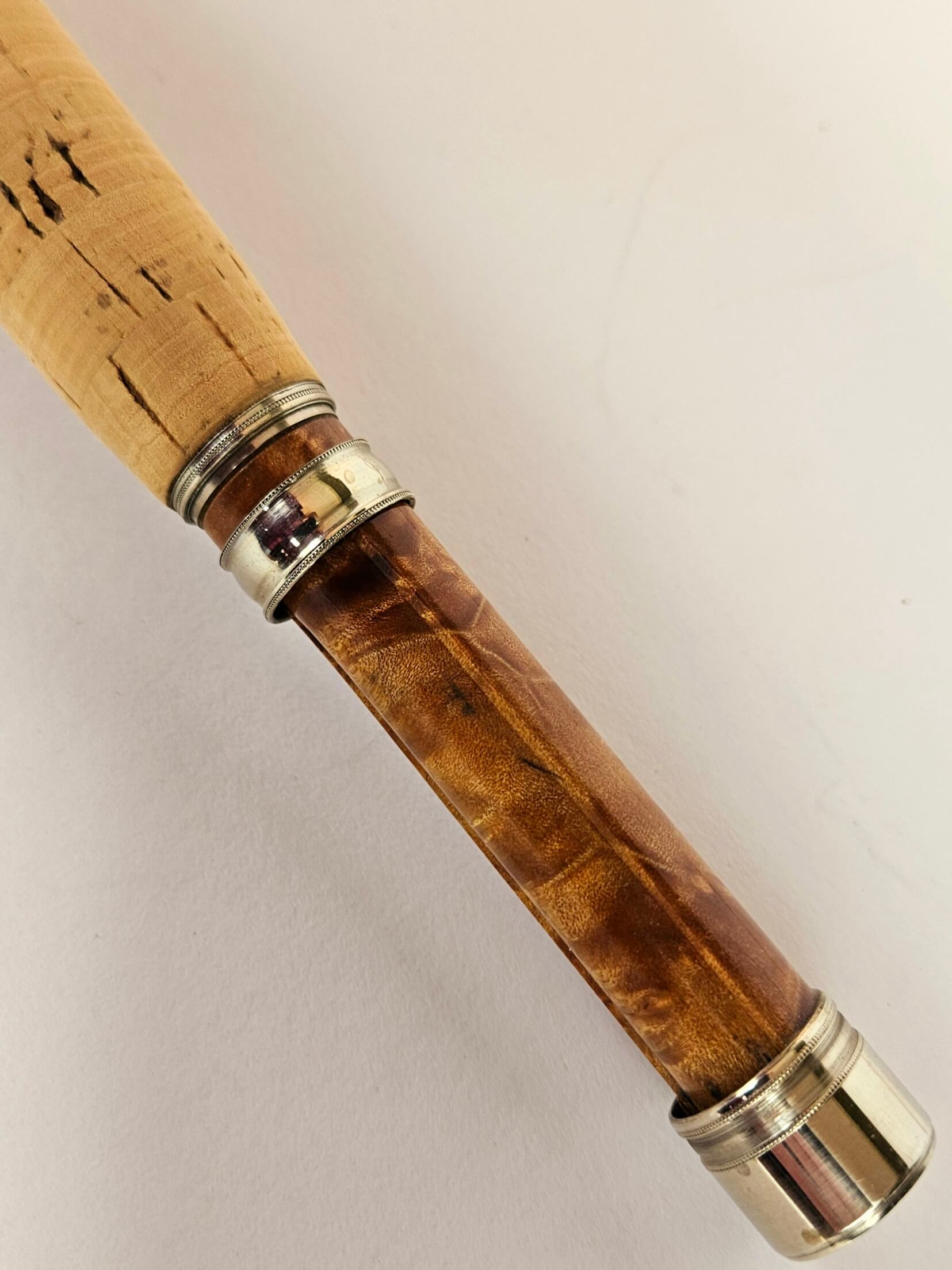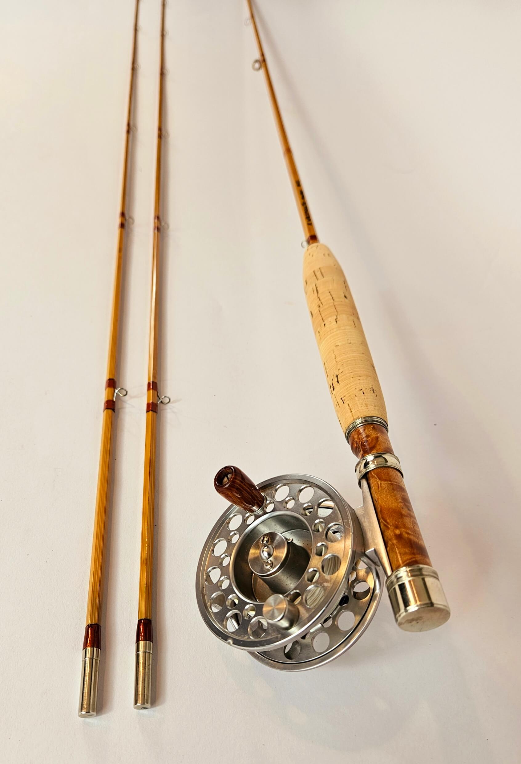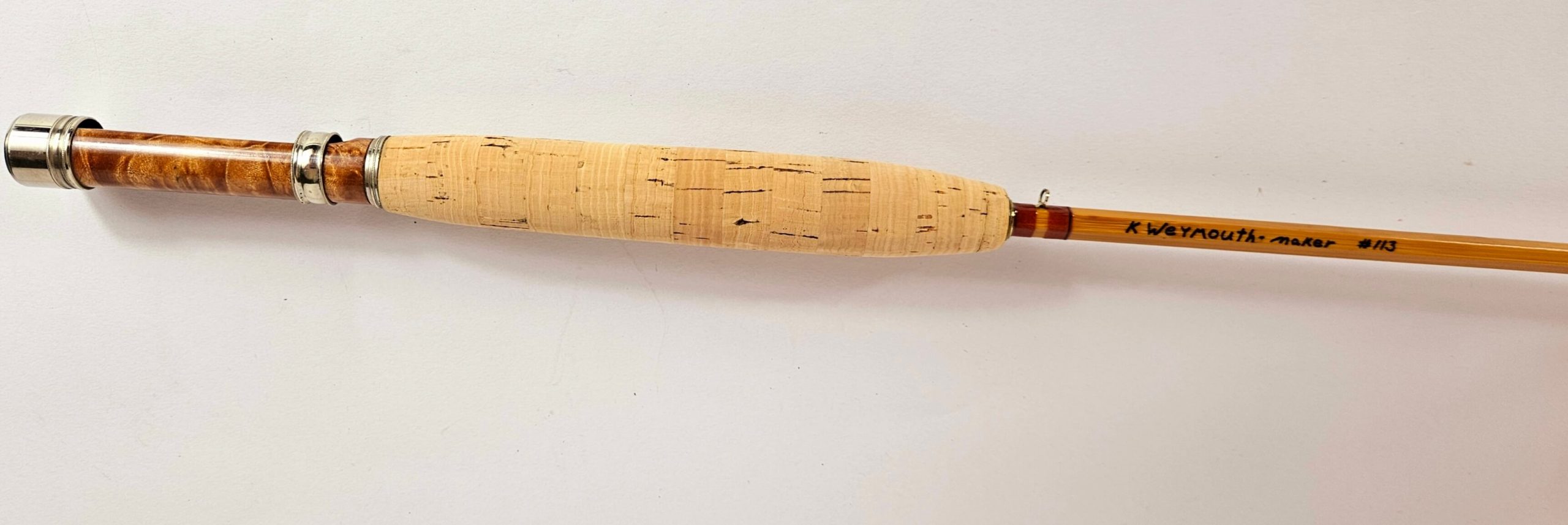 The Garrison style cork grip is 6 1/4” long. The nickel silver down locking cap and ring reel seat is coupled with a mortised, spalted maple, seat spacer balancing nicely with bright hardware and Chestnut wraps. Adorned with a 18% NS Stripper with a Cream agate insert stripper guide. The rod is finished in bright hardware and 15/64ths super Z style ferrules giving the rod a sleek overall appearance. This rod delivers a very classic look on the stream.